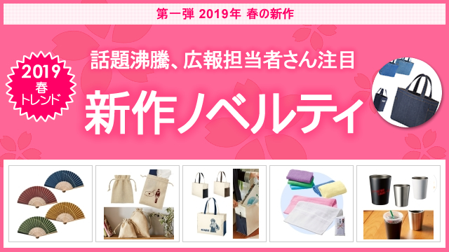 2019年春夏新作ノベルティは、落ち着いた雰囲気が特徴の各種コットンバッグのほか、記念品の新トレンドで人気急上昇のステンレスボトルを中心にラインナップ。フルカラー印刷対応品も多数ご用意!春~初夏のイベントにお役立てください。