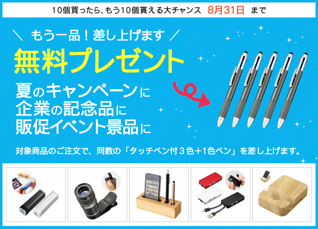 印象に残るノベルティなら「バッテリー」や「スタンド」などスマホ関連がおススメ!インスタ映えやSNSとの相性も抜群。8月31日までの期間中、対象商品のご注文で、注文同数の「3色ボールペン」をプレゼント!もちろん送料も弊社負担。