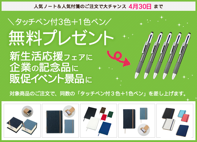 使い手を選ばないノベルティなら「ノート」や「付箋」が代表格。長く維持する販促効果は、配り手としても嬉しいところ。4月30日までの期間中、対象商品のご注文で、注文同数の「3色ボールペン」をプレゼント!もちろん送料も弊社負担。