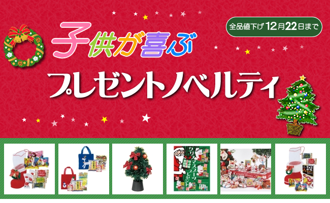 2017年冬のクリスマスセールの来店促進・店舗集客を盛り上げる景品各種が、全品値下げで更にお得になりました。ファミリー層へダイレクトにアプローチできる「お菓子セット」や「ツリー」など最短翌日発送にて多数ご用意。小ロット対応です。
