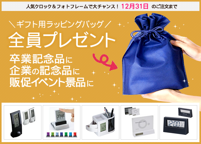 卒業記念品や企業の記念品、販促イベント景品などにピッタリなギフト用ラッピングバッグをプレゼント!12月31日までの期間中、対象商品のご注文で全員にもれなくお届けします!もちろん送料も弊社負担。このチャンスをお見逃しなく。