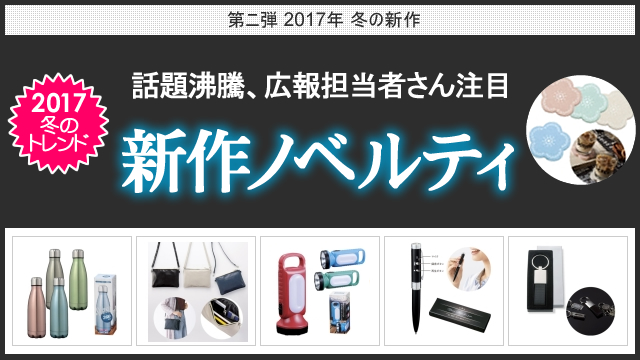 2017年冬の新作ノベルティに28商品が新たに追加されました。記念品に最適なプレミアムキーホルダー、定番アイテムのふせん、話題沸騰中の珪藻土コースターなど多数ご用意。冬のイベントにぜひぜひお役立てください。