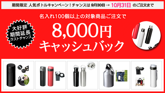 絶賛開催中の「<8千円現金還元>人気ボトルキャンペーン」は、皆様のご要望にお応えし、期間の再延長を決定しました。対象商品 名入れ100個以上のご注文でもれなくキャッシュバック。チャンスは10月31まで、これが最後のチャンスです。