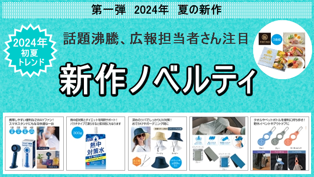 2024年初夏の新作 第一弾は、夏にぴったりな遊び心のあるクール商品や熱中症対策やアウトドア商品、夏のギフト商品など多数追加!目新しくカラフルな初夏から夏ノベルティ、夏の販促にピッタリです!是非ご覧ください。