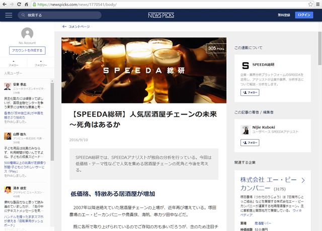 社長さんや店長さん、宣伝担当さん広報担当さんなど、ビジネスパーソンにオススメしたい今週の注目エントリーをご紹介/2016年9月12日版。トピック:【SPEEDA総研】人気居酒屋チェーンの未来~死角はあるか