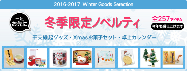 毎年恒例の[期間限定] 冬ノベルティのお取り扱いが、今年もいよいよ始まりました。2017年版卓上カレンダーをはじめ、クリスマスお菓子セットや干支縁起グッズを専門カテゴリにて多数ご案内。ボーナス商戦や年末年始商戦など、冬の集客販促にぜひご検討下さい。