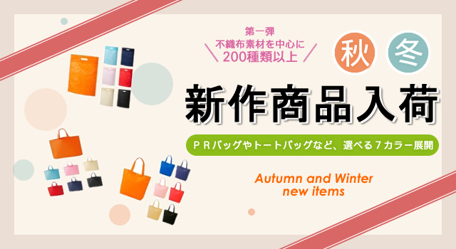 2016年秋冬新作の第一弾は、展示会用PRバッグやトートバッグなど、不織布素材のバッグを中心にラインナップ。お手頃な価格帯ながら小ロット名入れ対応(100個より)、選べる7色のバリエーションが大きな特徴となっています。一足お先の秋冬新作もお楽しみください。