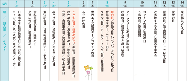 2016年5月に実施される国民的イベントや記念日を調べてみました。企業、店舗、自治体の集客プロモーションや販促キャンペーンに記念日を活用しましょう。風薫る行楽シーズンや母の日。爽やかな季節を楽しむイベント展開を。