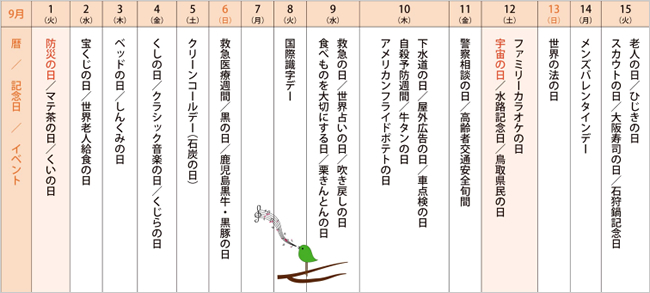 2015年9月の前半に実施される国民的イベントや記念日を調べてみました。企業や店舗、自治体の集客プロモーションや販促キャンペーンに記念日を活用しましょう。秋冬商戦、防災の日・敬老の日。秋の訪れを告げるフェア展開で来店促進。