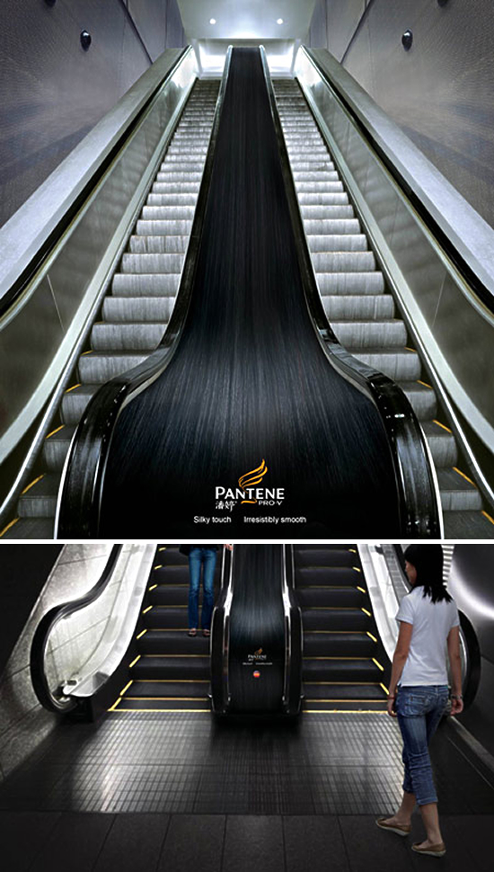 実用的な広告からネタっぽいものまで。面白いアイデアが盛り込まれたユニークな広告&看板を集めてみました。トピック:シャンプー(Pantene)の屋外広告。エスカレーターでシルキータッチを演出、指通りがよく艶やかになるという印象を与えていますね。<中国>