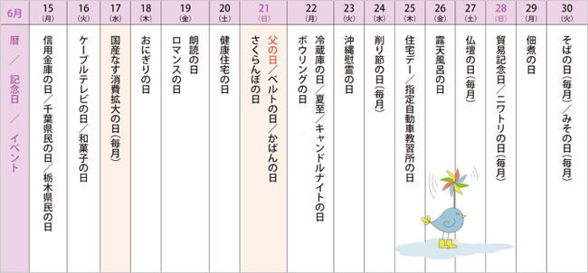 2015年6月の後半に実施される国民的イベントや記念日を調べてみました。企業、店舗、自治体の集客プロモーションや販促キャンペーンに記念日を活用しましょう。梅雨入り、衣替え、環境月間、ボーナス商戦を見据えて仕掛けづくり。