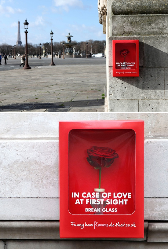 実用的な広告から、ネタっぽいものまで。面白いアイデアが盛り込まれたユニークな屋外広告を集めてみました。トピック:生花販売団体(Flower Council)の屋外広告。非常ボタンに見える「一目惚れ対策」のバラ。バレンタインデーに合わせ市内中に設置されたようです。<フランス>
