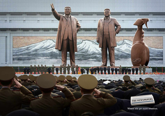 実用的な広告から、ネタっぽいものまで。面白いアイデアが盛り込まれたユニークな屋外広告を集めてみました。トピック:ZMG新聞広告協会の販促用ポスター。「かの国の指導者」と「20%増量の洗剤」。新聞はどの広告よりも注目を集めるとのキャンペーンです。<ドイツ>