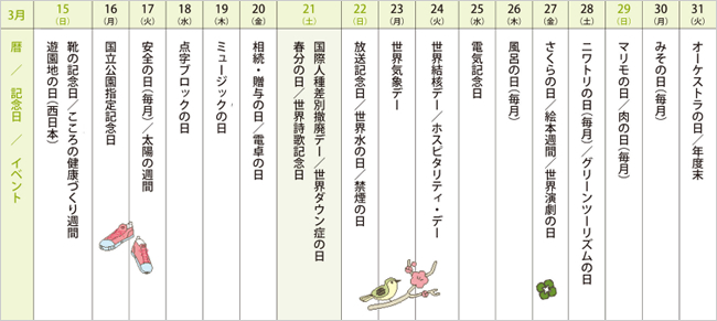 2015年3月の後半に実施される国民的イベントや記念日を調べてみました。企業、店舗、自治体の集客プロモーションや販促キャンペーンに記念日を活用しましょう。ひな祭り、入学&新生活準備。市場が活発な年度末を狙ってSP大作戦!