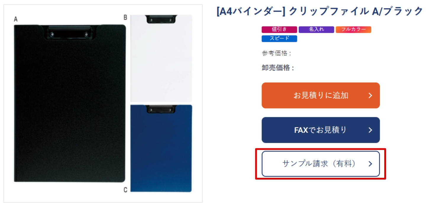 各商品の紹介ページからサンプル請求ができます。 サンプルは有償(参考上代価格)でのご提供となっていて、本体代金の他に配送料が必要となります。